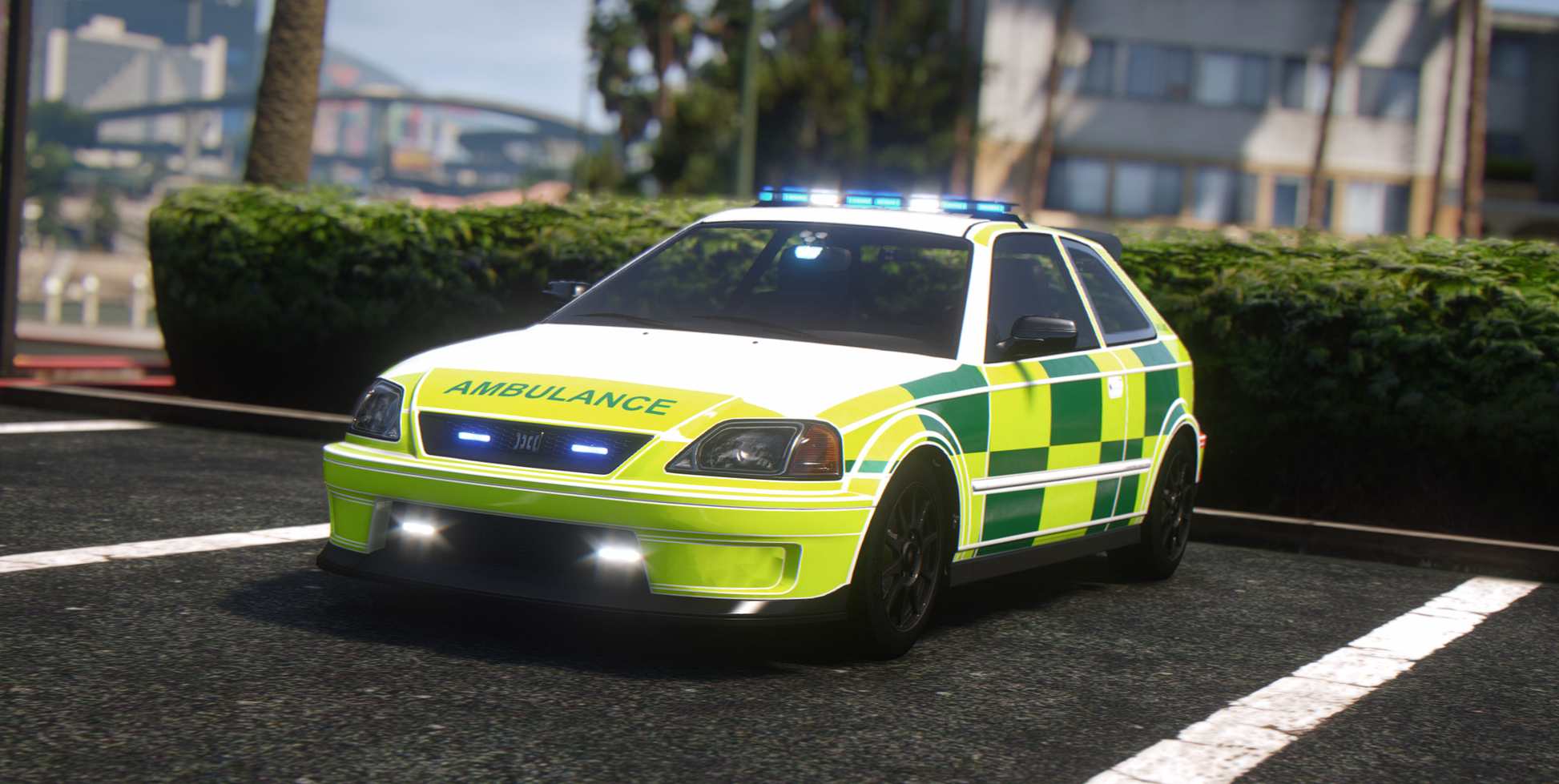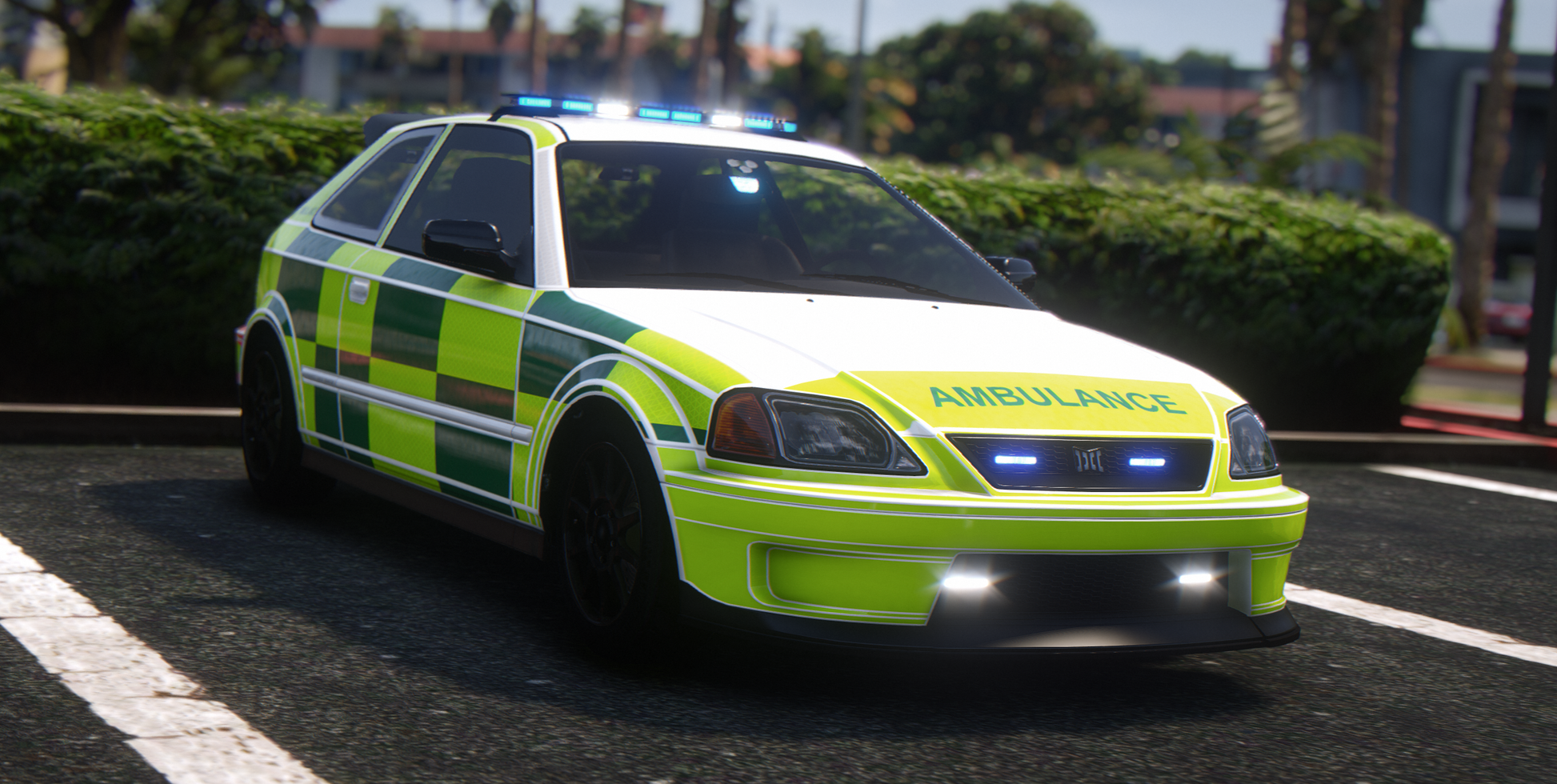 This package contains an Dinka Kanjo Ambulance ELS. The package is delivered fully prepared to drag and drop into your server, however if you wish to add them to your car packs they can be.
